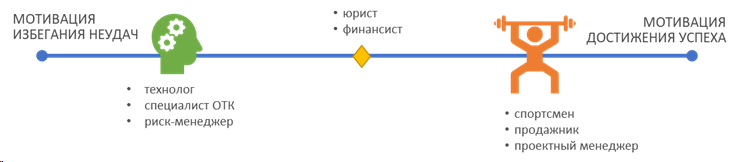 Предлагаемый мною подход прекрасно работает при профориентации и подборе персонала. Например, люди с высокой мотивацией избегания неудач будут хорошими технологами, специалистами ОТК и риск-менеджерами. А с мотивацией достижения – отличными продавцами. Посредине могут быть, например, финансисты и юристы, ведь в своей работе они должны разумно оценивать риски и не сдерживать развитие организации.