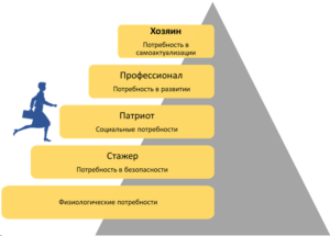 Окончив вуз, выпускник приходит в организацию и обычно начинает свой путь с самой низкой иерархической ступени – он становится СТАЖЕРОМ. У него еще недостаточно знаний и навыков (если быть честным), чтобы выполнять работу на уровне более опытных коллег. Поэтому для него важно, чтобы работа была максимально структурирована (описан алгоритм выполнения задач и объемов этих задач) и четко соответствовала его договоренностям с работодателем. Находясь на нижней ступени пирамиды Маслоу, для выпускника важно четкое соблюдение временных и денежных условий. Потому что для него актуально удовлетворение «естественных потребностей». Будучи стажером о карьере, как правило, говорят только амбициозные люди или те, кто не в состоянии осознать объем необходимых усилий для построения этой карьеры.