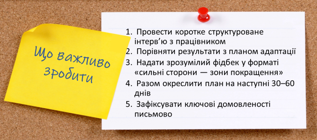 Це не формальна перевірка, а проміжна оцінка прогресу в адаптації, яка допомагає обом сторонам — і працівнику, і керівнику — зіставити очікування з реальністю, а також скоригувати плани.